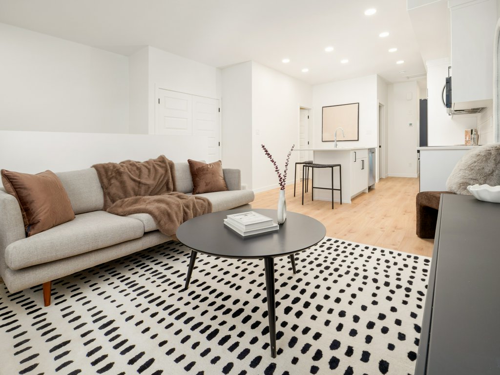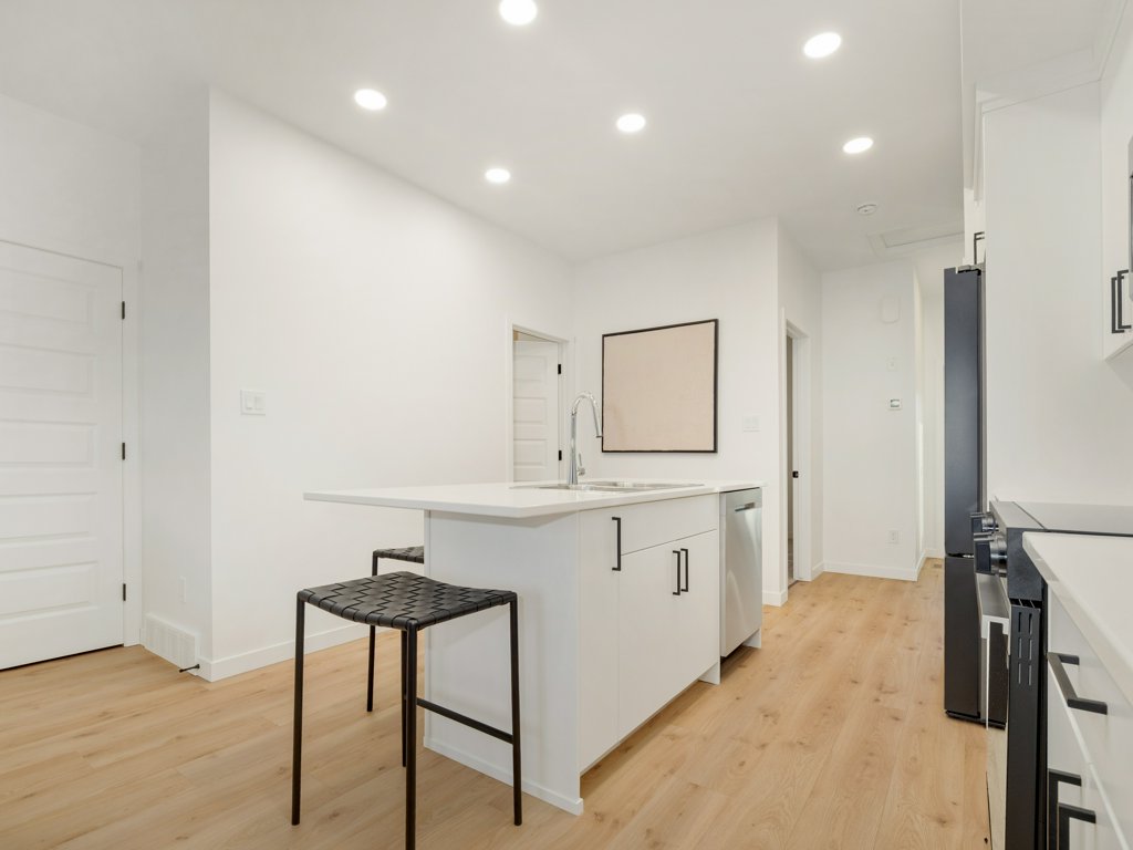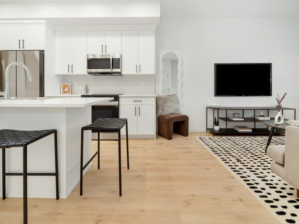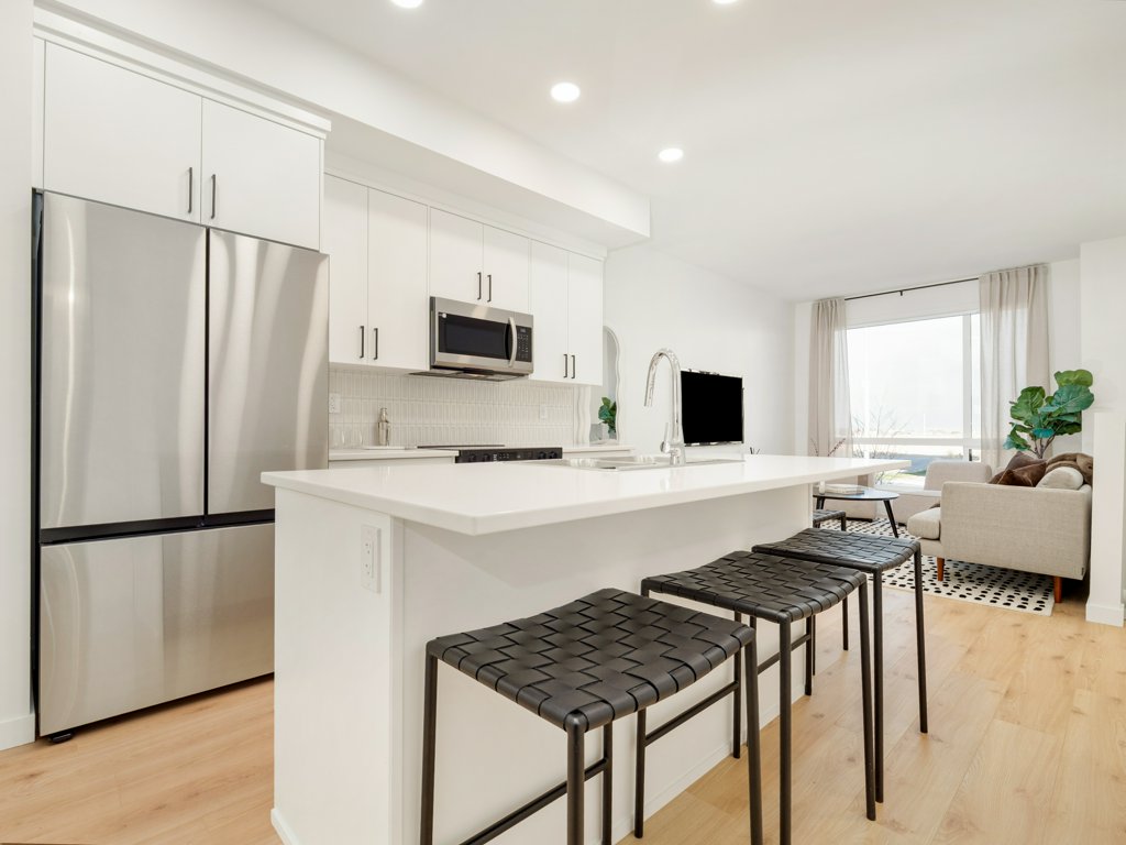 ● Modern, white backsplash tiles in kitchen